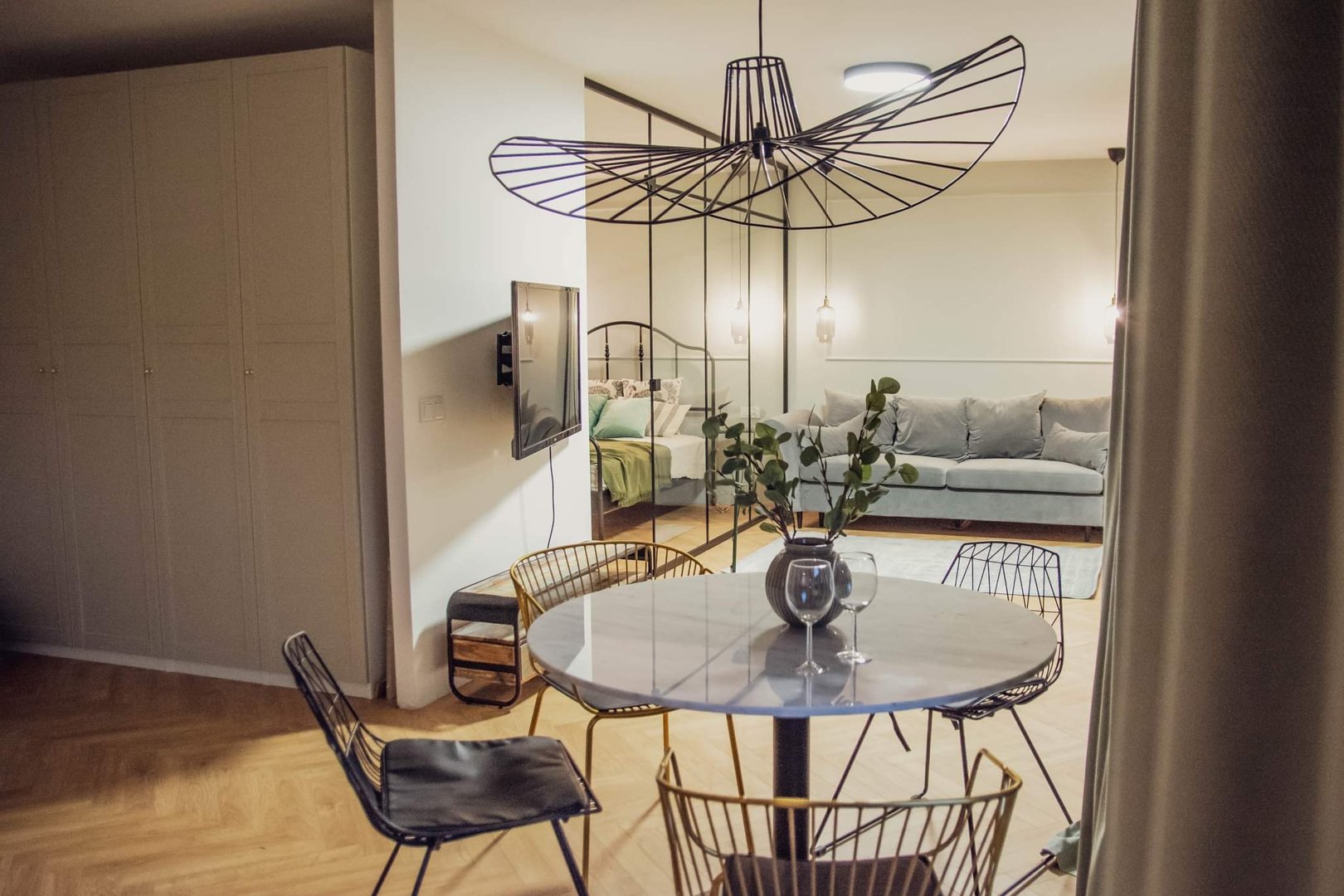 Pobookowane Motława River Apartment is a living room connected with a kitchenette with a beautiful marble dining table.